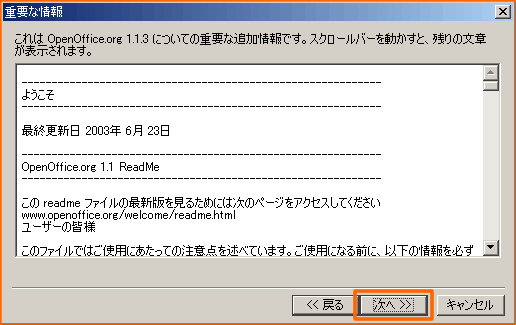 これから OpenOffice のインストールを行っていきますが、インストール先のフォルダはC:¥Program Files¥OpenOffice.org1.1.3 です。また、以下の説明の中では、このインストールフォルダを %OPENOFFICE_HOME% と記す場合もあります。